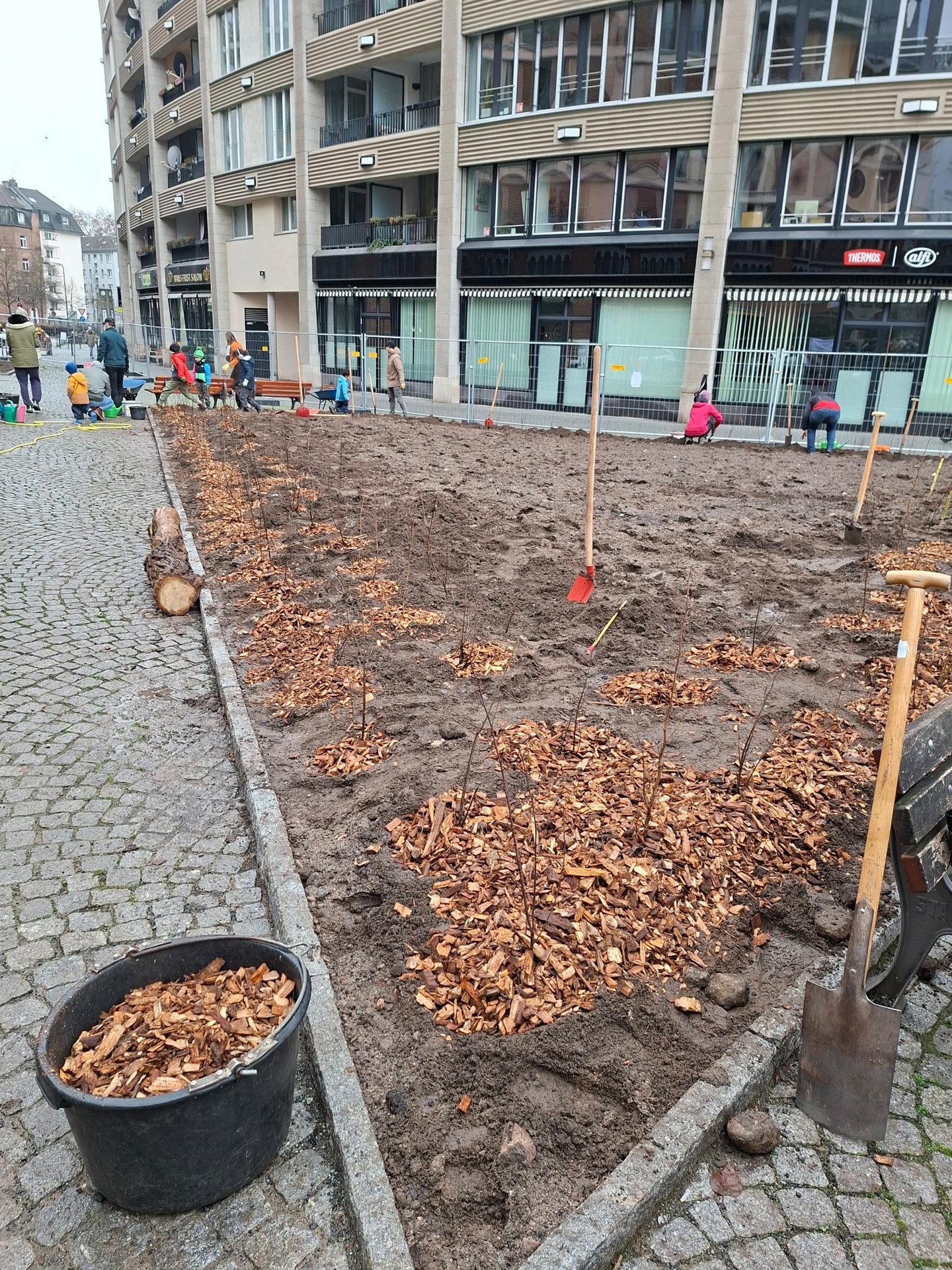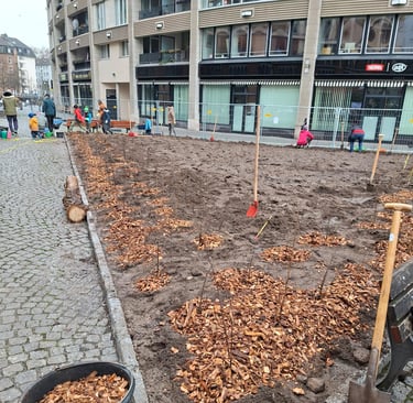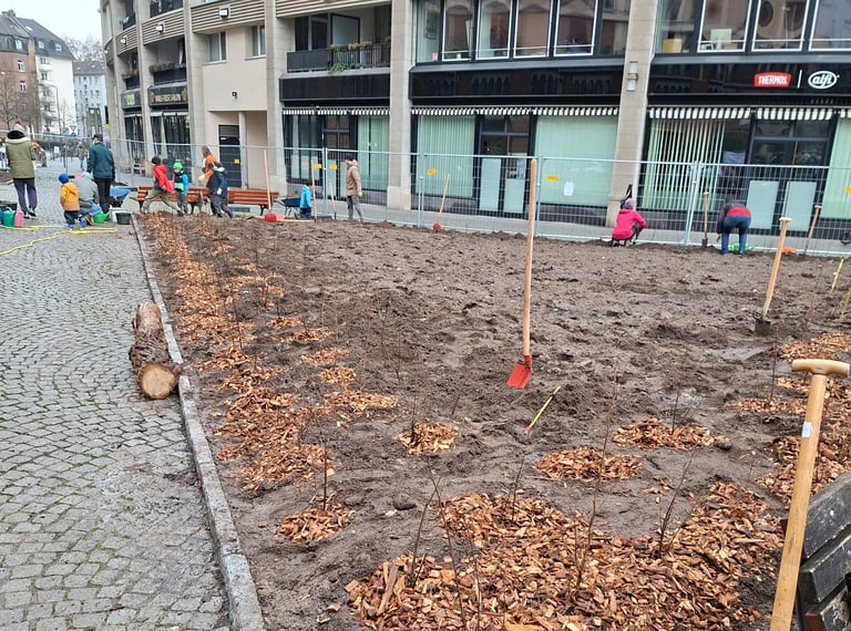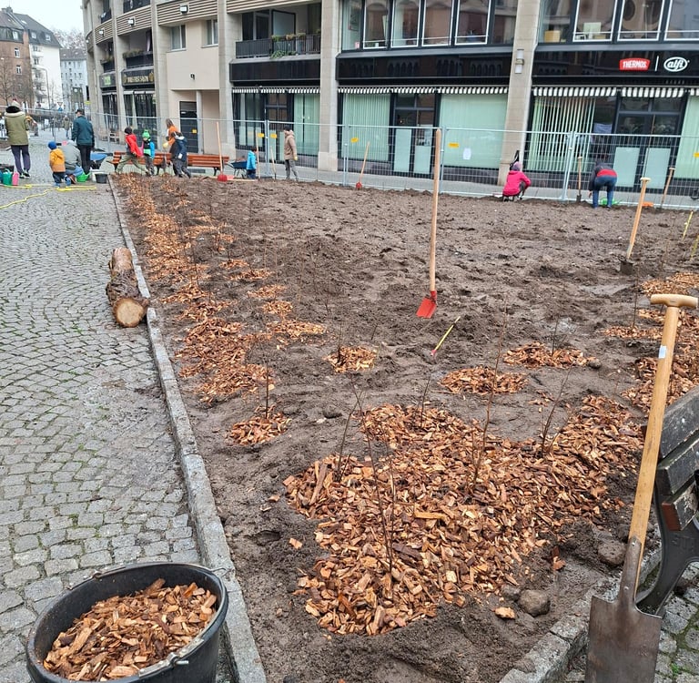Am 13.12.2025 geht es weiter mit dem bisher ambitioniertesten Projekt: gemeinsam mit dem Grünflächenamt und vielen Menschen aus dem Stadtteil werden wir auf dem Walther-von-Cronberg Platz in Sachsenhausen unser drittes Wäldchen pflanzen. Genauer gesagt: mehr als ein Wäldchen! Dort hat uns das Grünflächenamt vier Flächen (von 24-235 qm), die im Frühjahr entsiegelt wurden, für Tiny Forests zur Verfügung gestellt. Wir laden alle Naturfreund*innen und Hobbygärtner*innen herzlich um Mitmachen ein. Familien und größere Gruppen bitten wir, sich bei uns unter folgendem Link anzumelden: https://mainwaeldchen.de/anmeldung.