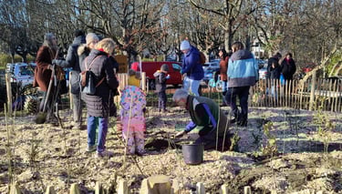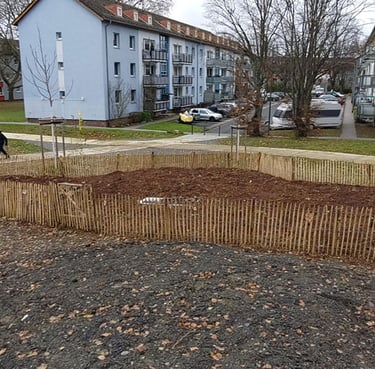 Das zweite Wäldchen haben wir am 22.11.2025 auf der in diesem Jahr neu gestalteten Betramswiese ("Berti") im Stadtteil Dornbusch gepflanzt. Unser Kooperationspartner dort war der Verein Natürliche Betramswiese e.V., insgesamt haben an die 100 Schulkinder, Geschwister, Eltern und Lehrerinnen der Heinrich-Seliger-Schule sowie viele Nachbar*innen mitgeholfen, einen ca. 120 qm großen Tiny Forest anzulegen.