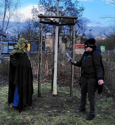 Im Fechenheimer Wald ist der streng geschützte Heldbockkäfer zu Hause und er möchte dort bleiben. Leider soll er einer Stadtautobahn weichen und viele seiner Nachkommen, die dort in alten Eichen wohnen, würden sterben, wenn ihre Bäume gefällt würden. Doch "Heldi" ist nicht mutlos, er macht sich auf den Weg, um in Frankfurt nach Verbündeten zu suchen und für mehr Artenvielfalt einzutreten. Am Freitag, den 28.02. kam er um 16:30 Uhr bei uns am MainWäldchen vorbei und erzählte uns gemeinsam mit Pilz und Baum, warum der Schutz unserer Artenvielfalt so wichtig ist. Danach setzten wir uns in den Bus und fuhren zur "Grünen Lunge am Güntersburgpark".
