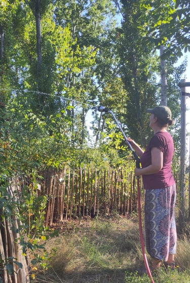 Die trockenen Wochen im Juli und August haben im MainWäldchen erste Spuren von Trockenstress hinterlassen, weshalb wir uns kurzfristig entschlossen haben, unser Wäldchen (zum ersten Mal seit der Pflanzung im Dez 2023!) zu gießen. Nach 1,5 Std. war alles gut durchnässt und wir konnten beim Gießen in Ruhe die vielfältigen Tiere und Pflanzen beobachten. Es ist beeindruckend, wie viel die Gehölze im zweiten Jahr gewachsen sind, einige Pflanzen sind mittlerweile gut 3,5 Meter hoch! Auf der Sonnenseite sind die Pflanzen etwas kleiner als im Norden und Osten. Aber insgesamt sind wir sehr zufrieden.